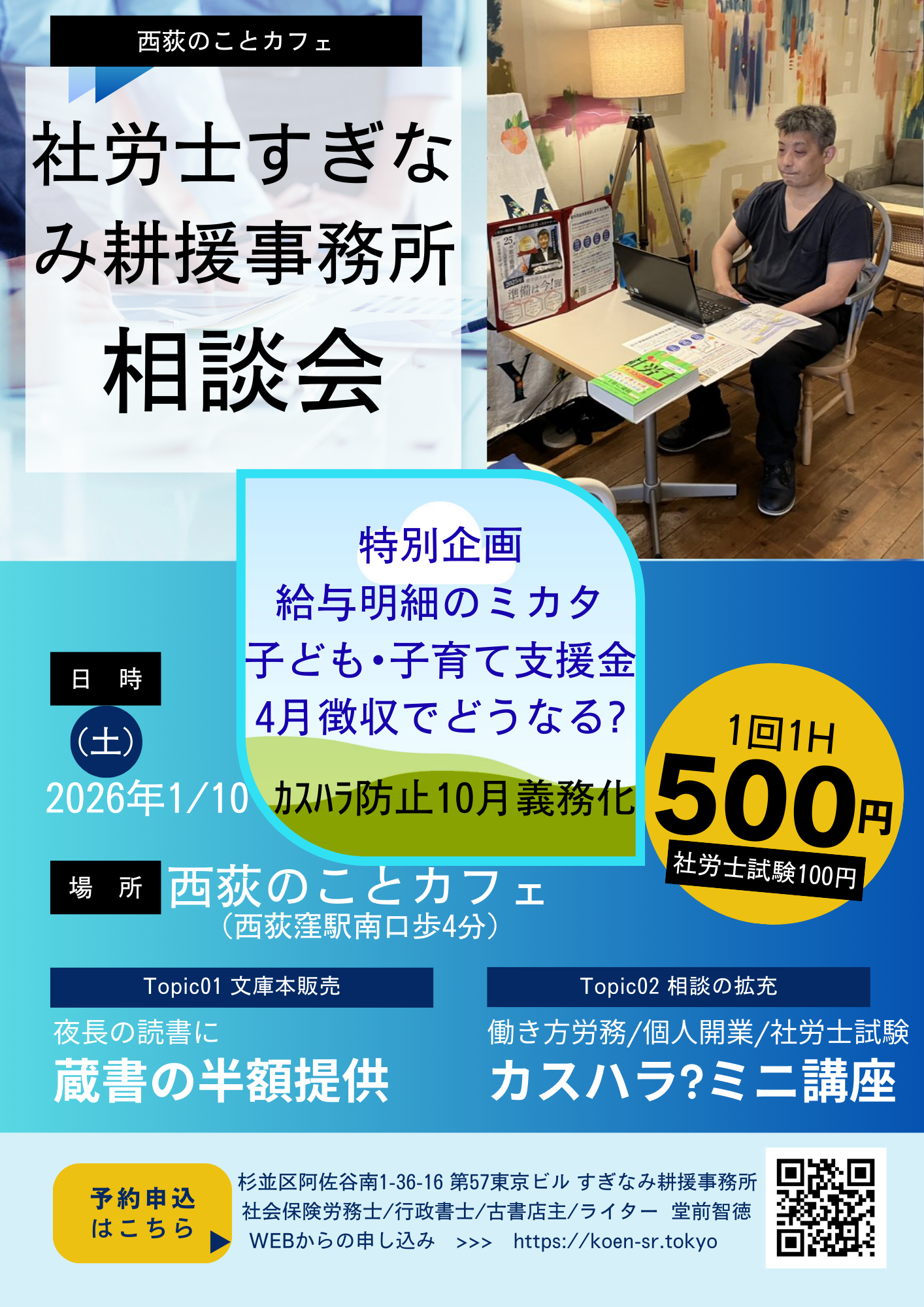 直近:1月10日(土)11~17時、会場:西荻のことカフェ https://nishioginokoto.co.jp/1回500円、1時間以内、資料無料、予約優先→お申込み等外部申込フォーム社労士受験相談のみ100円